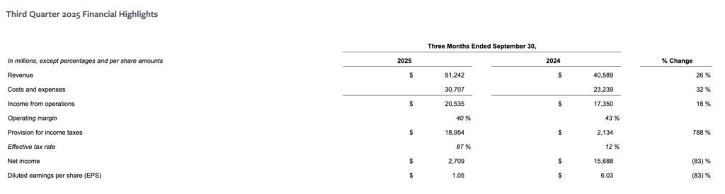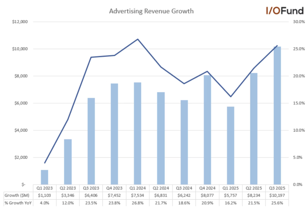 Dengan kata lain, Meta menghasilkan pertumbuhan dolar YoY yang lebih besar dalam pendapatan iklan dari basis yang lebih besar – pada Q3 2025, pertumbuhannya mencapai $10 miliar YoY dari basis $40 miliar, dibandingkan dengan pertumbuhan $7,5 miliar pada Q3 2024 dari basis $33,6 miliar.