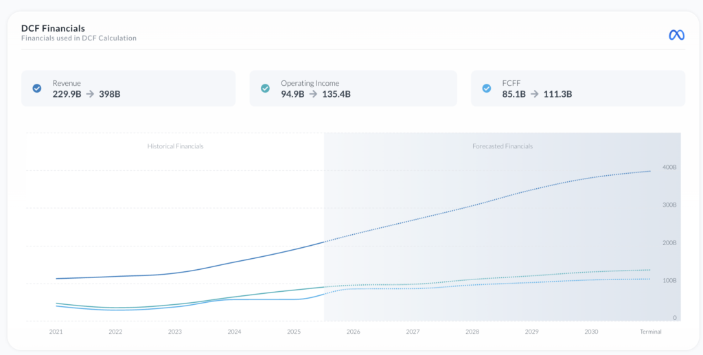 Berdasarkan perhitungan menggunakan metode Discounted Cash Flow (DCF), proyeksi pertumbuhan Meta menunjukkan tren yang sangat positif untuk beberapa tahun ke depan. Dalam periode antara 2021 hingga 2030, perusahaan diperkirakan mengalami peningkatan signifikan dalam tiga indikator keuangan utama: Pendapatan (Revenue), Laba Operasional (Operating Income), dan Free Cash Flow to Firm (FCFF).