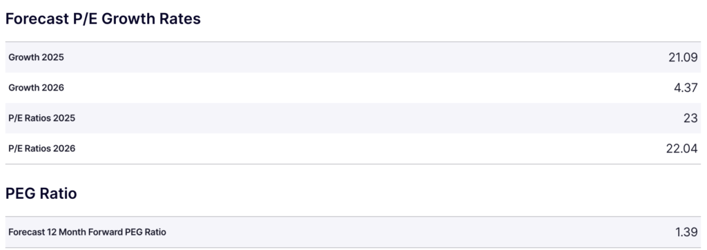 Pada tahun 2026, rasio P/E Meta diperkirakan sedikit menurun menjadi 22,04, yang menunjukkan adanya penurunan valuasi pasar terhadap perusahaan. Selain itu, rasio PEG untuk 12 bulan ke depan diperkirakan mencapai 1,39, yang menunjukkan bahwa meskipun Meta mengalami pertumbuhan yang signifikan, valuasi sahamnya masih sebanding dengan tingkat pertumbuhannya.
