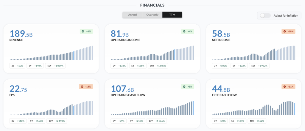 Pada 3 tahun terakhir, pendapatan perusahaan meningkat sebesar 60%, dan dalam lima tahun terakhir, pendapatan naik 140%. Bahkan dalam sepuluh tahun terakhir, Meta mencatatkan kenaikan pendapatan sebesar 108%, dengan total pendapatan $189,5 miliar.
