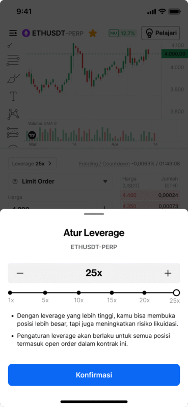 Dengan fitur terbaru ini, kamu punya kendali penuh buat mulai dari leverage rendah untuk langkah lebih terukur, hingga 25x untuk potensi yang lebih besar. Semuanya ada di kendali kamu.