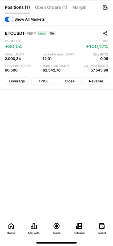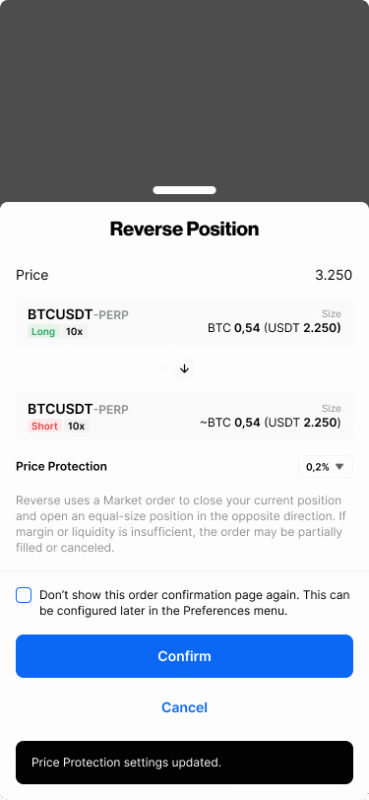 Contoh: Jika kamu memiliki posisi Long 1 BTC, lalu melakukan Reverse, maka sistem akan menutup posisi Long 1 BTC tersebut dengan harga pasar dan langsung membuka posisi Short 1 BTC dengan harga pasar.