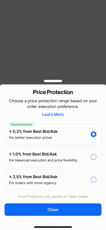 5. Pilih Price Protection sesuai dengan preferensi order execution kamu. Lalu, klik Close. Note: Price Protection adalah fitur di Pintu Futures yang membatasi slippage dengan mengatur toleransi harga saat menggunakan Market Order, selengkapnya cek di sini.