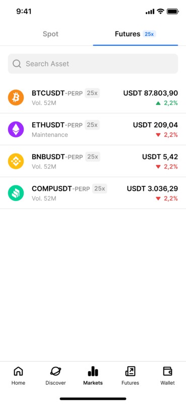 3. Temukan menu Futures di halaman utama atau di bagian navigasi bawah. Kamu juga bisa klik Market dan melihat menu Futures dengan leverage 25x