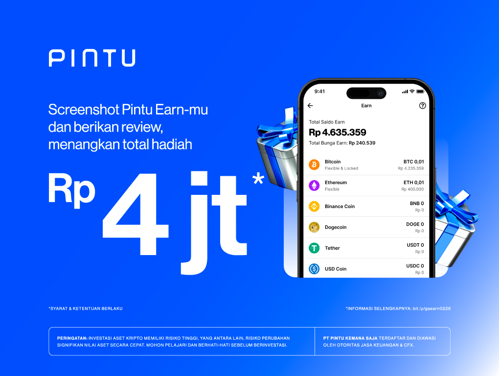 Giveaway menarik hadir lagi di bulan ini! Yuk screenshot Pintu Earn milikmu, sertakan feedback dan review nya, menangkan total hadiah senilai Rp4 juta! Baca mekanisme & syarat dan ketentuan lengkapnya di sini!