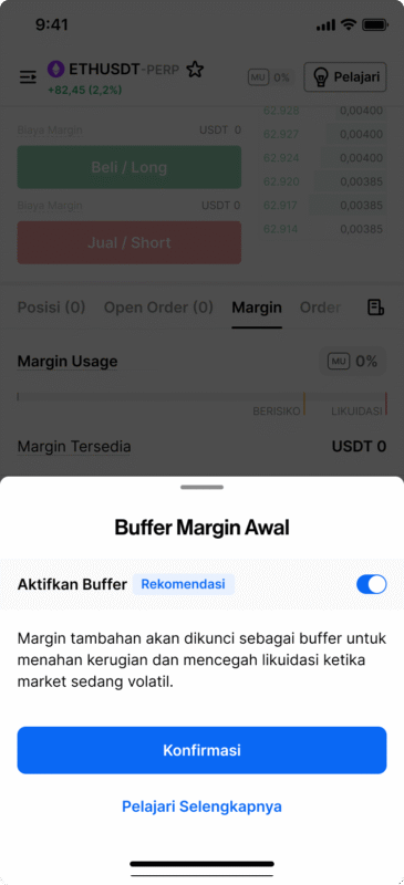 Initial Margin Buffer secara otomatis aktif untuk semua pengguna. Jika kamu ingin menonaktifkannya, buka tab Margin di halaman Trade. Dengan menonaktifkan fitur ini, margin yang dikunci untuk posisi terbuka hanya akan sebesar Maintenance Margin (MM) tanpa tambahan Initial Margin Buffer.