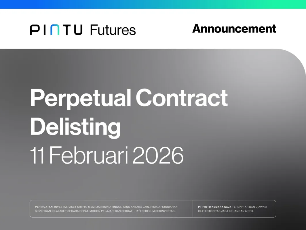Hi Teman Pintu! Kami terus berusaha memberikan pilihan crypto yang terbaik untuk investasimu. Oleh karena itu, berdasarkan peninjauan yang telah dilakukan, kami memutuskan untuk melakukan delisting 50 kontrak futures pada tanggal 11 Februari 2026.
