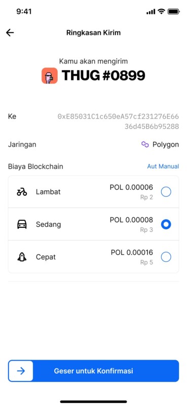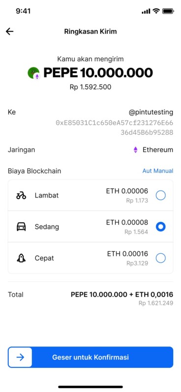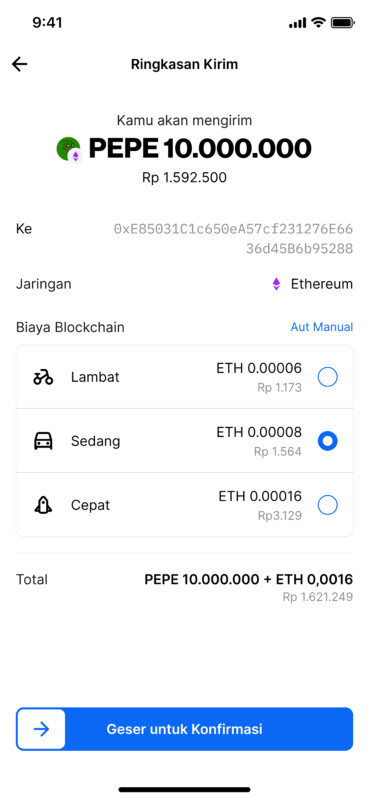 5. Pilih blockchain fee (slow, medium, atau fast) untuk menentukan kecepatan proses transaksi. Lalu, geser toggle di bawah layar untuk menyetujui pengiriman aset crypto. Masukan PIN atau konfirmasi dengan Face ID.