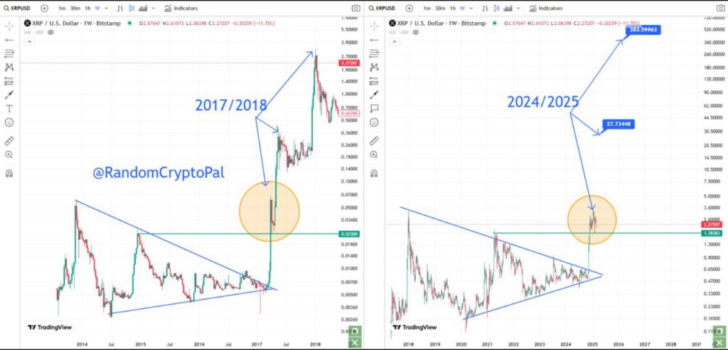 According to him, the same pattern is repeating itself in 2025, despite the token’s 33% drop in February. According to Random Crypto Pal, Ripple’s (XRP) journey to $385 will start with a small recovery. He predicts that the token will first reach $27, a target also proposed by another analyst called Egrag Crypto. From there, Random Crypto Pal sees Ripple (XRP) going through a pullback before finally surging to triple-digit prices.