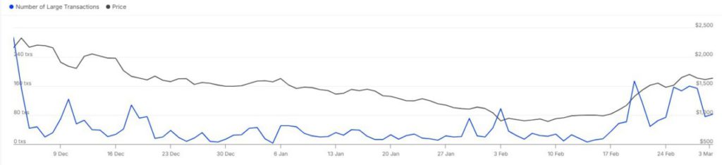 Although the price trend appears bearish, on-chain data shows more optimistic signals. MKR’s large transaction activity increased by more than 10% in the last 24 hours, signaling movement from large investors.