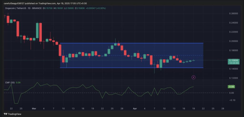 Looking at the Dogecoin price chart, it is noted that since March 9, 2025, the DOGE price has been moving in a parallel channel. Another positive side is that Dogecoin’s Chaikin Money Flow (CMF) indicator is moving up, and is currently at 0.08.