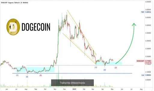 Crypto analyst, MasterAnanda, revealed that the current consolidation could be the beginning of a significant surge similar to the Dogecoin (DOGE) rally in the past.