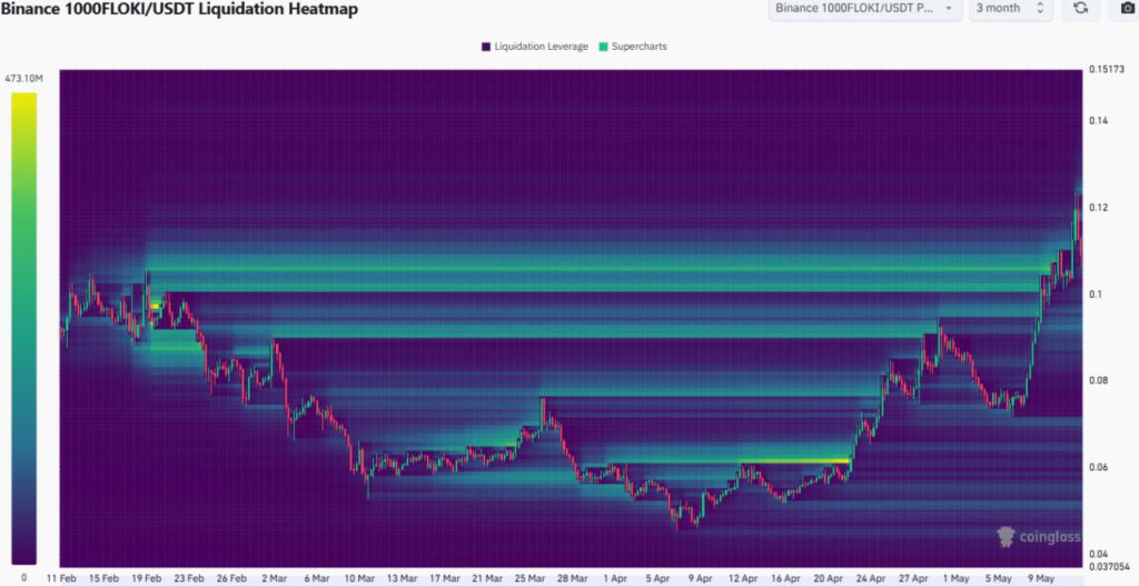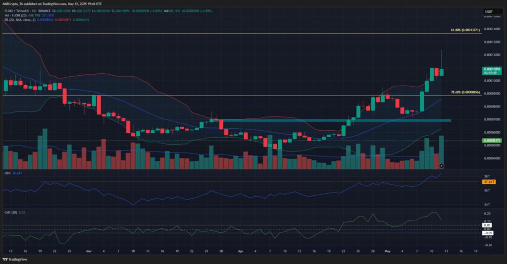 FLOKI showed the formation of a bullish order block at $0.0000695, which was the lower high formed in March. This area, highlighted in cyan, was successfully broken in April and almost retested as a demand zone. This breakout changed the market perception from bearish to bullish. With this bullish structure, FLOKI will likely eye the 61.8% Fibonacci retracement level of the November rally as the next bullish target.