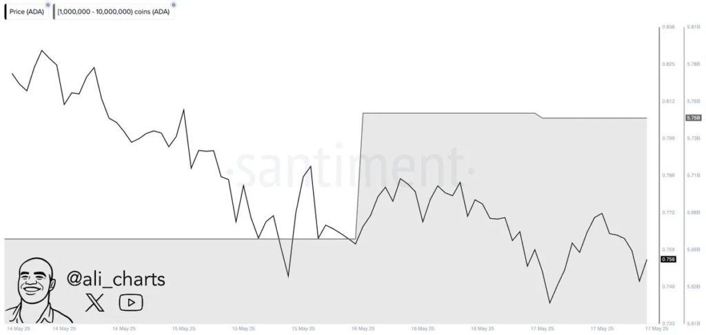 On-chain data from Santiment shows that whale has accumulated over 80 million ADA in the last 48 hours. This signals increased confidence among big players, which may set the stage for a breakout. Whale activity often precedes big market moves, and their renewed interest in Cardano could be an early signal of a sustained rally.