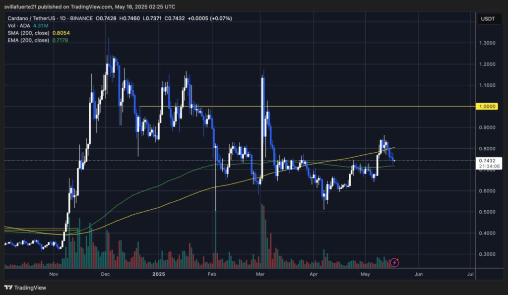 Cardano is currently trading around $0.74, testing a key support zone after failing to hold above the $0.80 mark. The chart shows a strong spike in early May that took ADA to a local peak near $0.90, but since then the price has pulled back and is now consolidating just above its 200-day EMA (around $0.71). This level acts as dynamic support and could be critical for the next move.