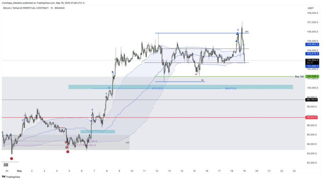 Bitcoin (BTC) briefly touched last week’s high of $105,663 before facing strong selling pressure that pushed the price down by 4.23% to $102,579. This drop came after Bitcoin (BTC) reached a new high of $107,114 on the Binance platform.