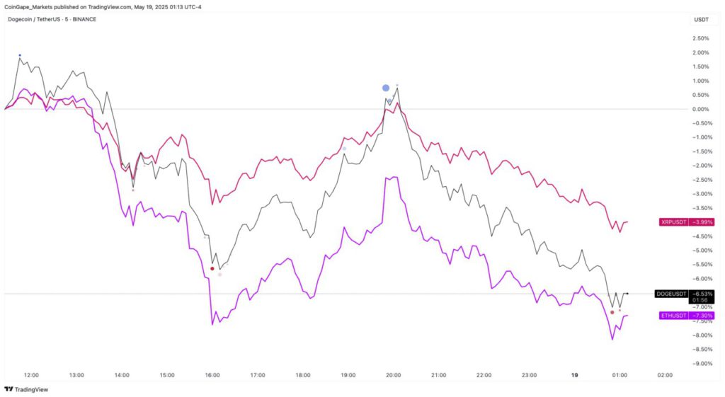 The high correlation between Bitcoin (BTC) and other altcoins such as Ethereum (ETH), Ripple (XRP), and Dogecoin (DOGE) explains why Bitcoin’s (BTC) price drop has a domino effect. Ethereum (ETH) has decreased by 8.76% in the last 13 hours, while Ripple (XRP) lost 5.31% of its value. Dogecoin (DOGE) hasn’t escaped this impact either, with a drop of 9.11%.
