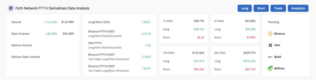 In the last 24 hours, Pyth Network (PYTH) trading volume increased by 45.3% to $38.5 million. Derivatives volume also jumped 58% according to data from Coinglass. The 0.71% rise in open interest indicates that new positions were added, not closed.