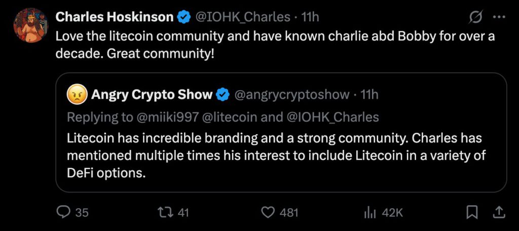 Charles Hoskinson has officially announced that Cardano (ADA) will collaborate with Litecoin (LTC) on the DeFi project. This partnership will hopefully open up more opportunities for both blockchains in developing more efficient and decentralized financial solutions.