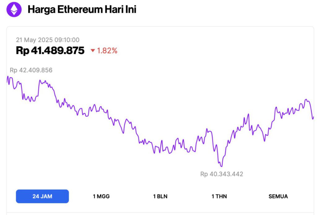 Per 21 Mei 2025, harga Ethereum (ETH) tercatat berada di sekitar $2,522 atau setara dengan Rp41.489.875, mengalami penurunan 1,82% dalam 24 jam terakhir. Sepanjang periode ini, ETH sempat menyentuh level tertingginya di Rp42.409.856, dan level terendahnya di Rp42.409.856.
