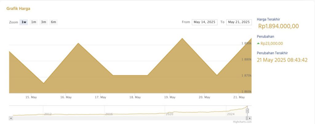 The last recorded price was IDR 1,894,000, an increase of IDR 23,000 compared to the previous period. This data was last updated on May 21, 2025 at 08:43:42.