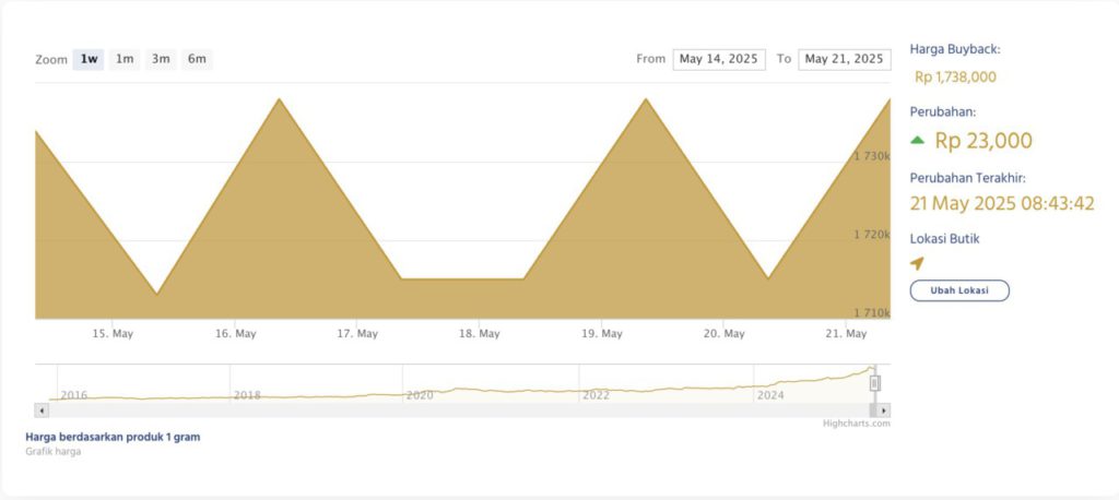 The last recorded buyback price was IDR 1,738,000, representing an increase of IDR 23,000 compared to the previous price. This data was last updated on May 21, 2025 at 08:43:42.