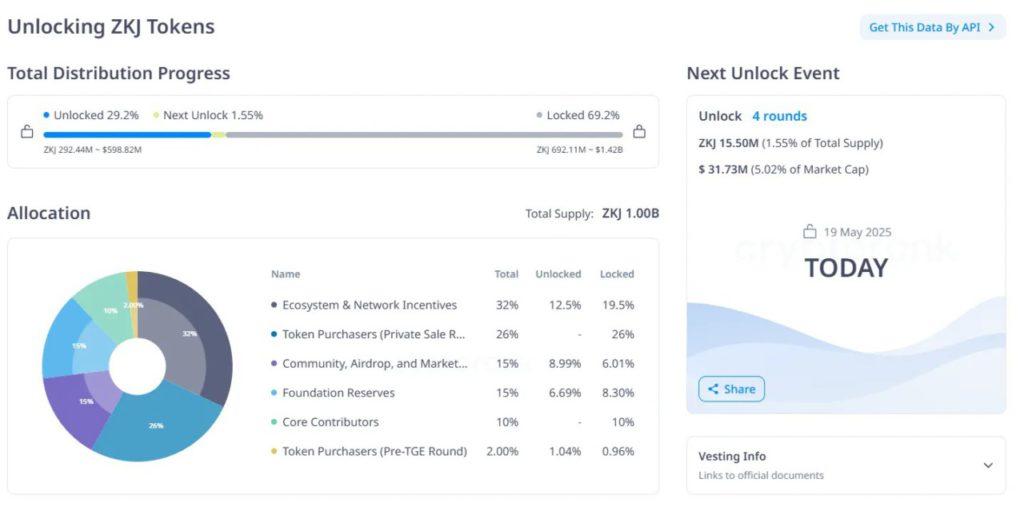Polyhedra Network, known for its zkBridge technology, facilitates secure and scalable inter-chain interoperability. ZKJ tokens are used for operations, incentives, and governance within the network. On May 19, there will be a release of 15.50 million ZKJ tokens, with a value of approximately $31.73 million, which is equivalent to 5.02% of the current market capitalization.