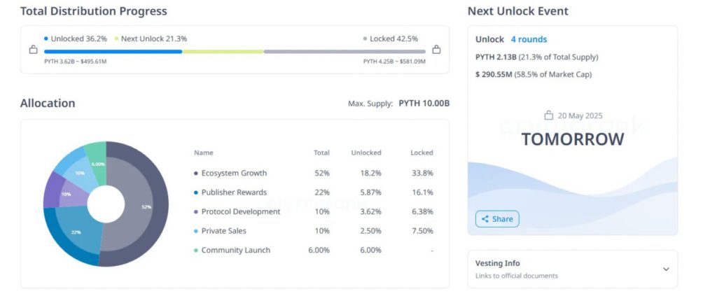 Pyth Network provides real-time financial data for smart contracts and is a critical oracle infrastructure provider in the DeFi ecosystem. PYTH tokens are used to incentivize data publishers and contributors. On May 20, Pyth will release 2.13 billion PYTH tokens, with a value of $289.96 million, which represents 58.8% of the current market capitalization.