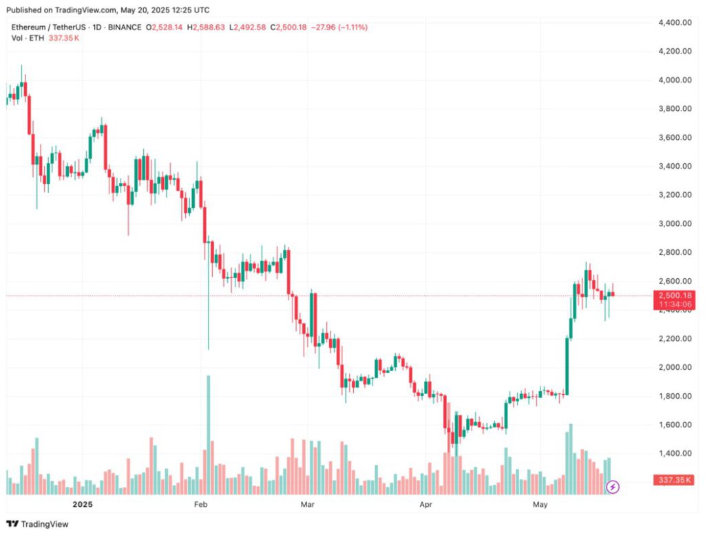 Despite many bullish predictions, Gianni Pichichero, another crypto analyst, warned about a potential retracement to $2,350. His analysis shows the appearance of lower lows on the daily chart of Ethereum (ETH), which is a bearish signal. Currently, Ethereum (ETH) is trading at $2,500, up 3.6% in the last 24 hours.