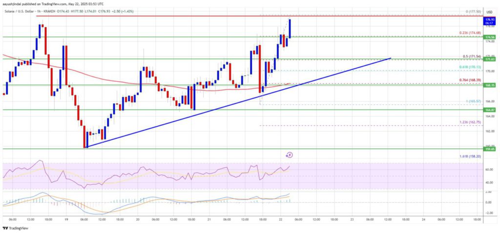 The highest peak was formed at $177.50 and now price is consolidating gains above the 23.6% Fibonacci retracement level of the recent wave from $165 to $177.50. Solana (SOL) is now trading above $172 and the 100-hour simple moving average. There is also a bullish trend line connecting with support at $170 on the hourly chart of the SOL/USD pair.