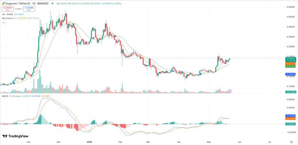 Dogecoin’s on-chain data is showing positive signs that support technical analysis. Large wallets, or whales, have shown significant accumulation behavior, with net purchases of over 1 billion DOGE recently. This indicates growing confidence among large investors in Dogecoin’s upside potential. Additionally, there has been an increase in large transactions on the Dogecoin network, which is often an indicator of portfolio rebalancing by large holders ahead of anticipated market volatility.
