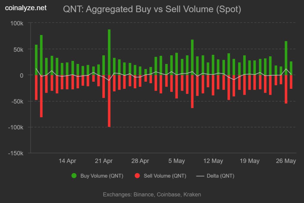 Quant trading volume (QNT) jumped dramatically by 606%, totaling $71 million. Specifically on the spot market, there was a 346.9% increase in volume to $40.2 million, indicating increased activity from both buyers and sellers. Buyers raised 27,000 QNT tokens, while sellers offloaded 26,000 QNT tokens, signaling high market engagement.