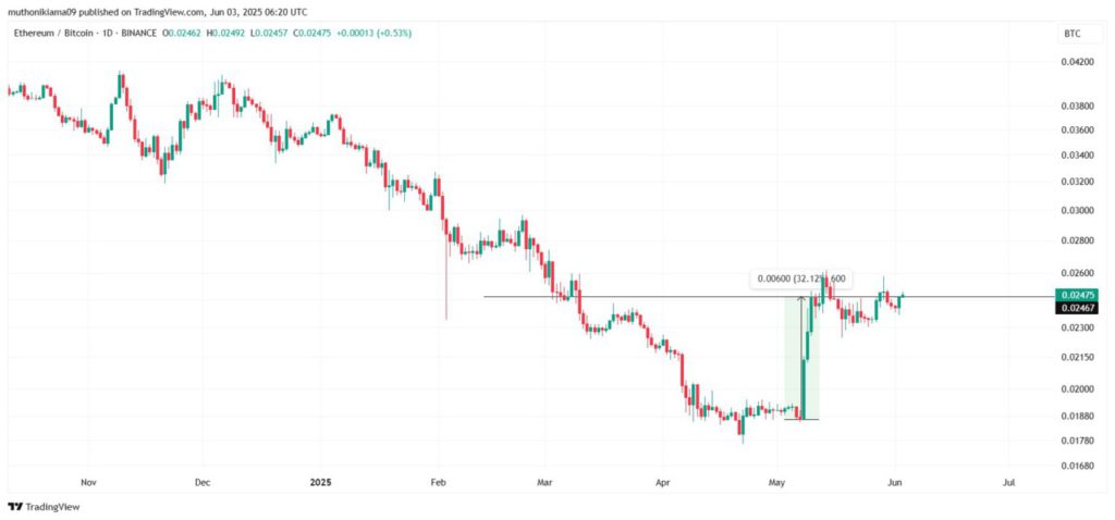Since May 8, the ETH/BTC ratio has seen a sharp rise, signaling a shift in momentum towards a more bullish direction for Ethereum (ETH). Currently, the ratio has increased from 0.0186 to 0.024, a jump of more than 30% in the span of three weeks. This suggests that Ethereum (ETH) price is on a stronger trend compared to Bitcoin (BTC).