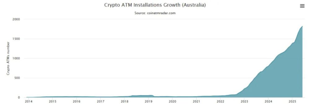 The number of Bitcoin (BTC) ATMs in Australia has increased dramatically, from just 40 units in 2022 to more than 1,800 units by 2025. This growth reflects the deeper integration of crypto transactions in everyday life in the country.