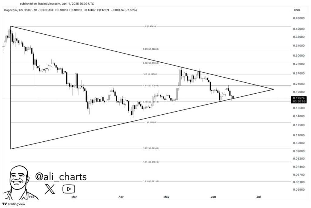 In a post on X, Ali Martinez showed a chart showing the current position of Dogecoin (DOGE) from a technical analysis perspective. The chart shows that Dogecoin (DOGE) may have been trading within a triangle-shaped channel for the past few months. This channel is not just any triangle, but a type called a Symmetrical Triangle.