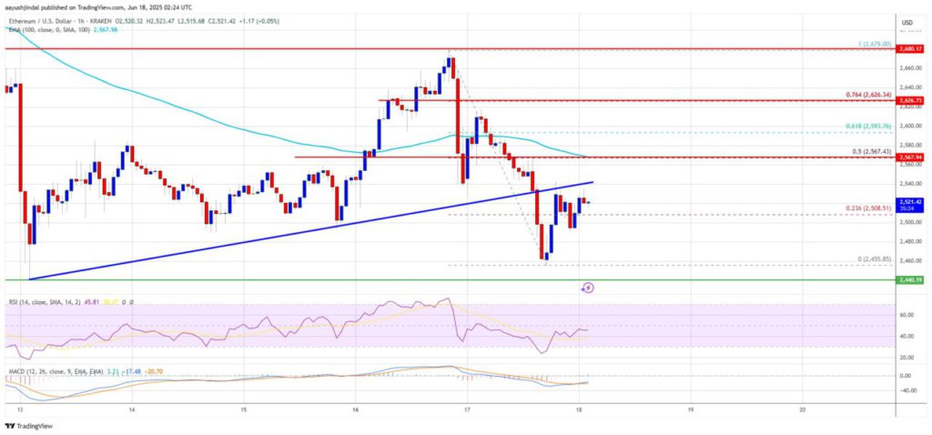 Ethereum (ETH) experienced a sharp decline after failing to maintain momentum above $2,680. The price dropped below the $2,620 and $2,600 levels, indicating the dominance of sellers in the market. The decline was compounded by a break below the bullish trend line that previously supported the price at $2,540 on the ETH/USD hourly chart. Currently, Ethereum (ETH) is trying to find a foothold above $2,450 after several attempts to recover its position.