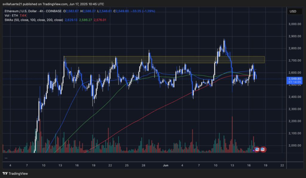 Ethereum (ETH) continues to show its resilience by trading above the $2,500 mark, but the 4-hour chart shows continued difficulty in breaking the $2,675-$2,700 resistance zone. This zone, marked on the chart, has been a rejection zone several times since early June, hampering bullish attempts to break out of the current range.