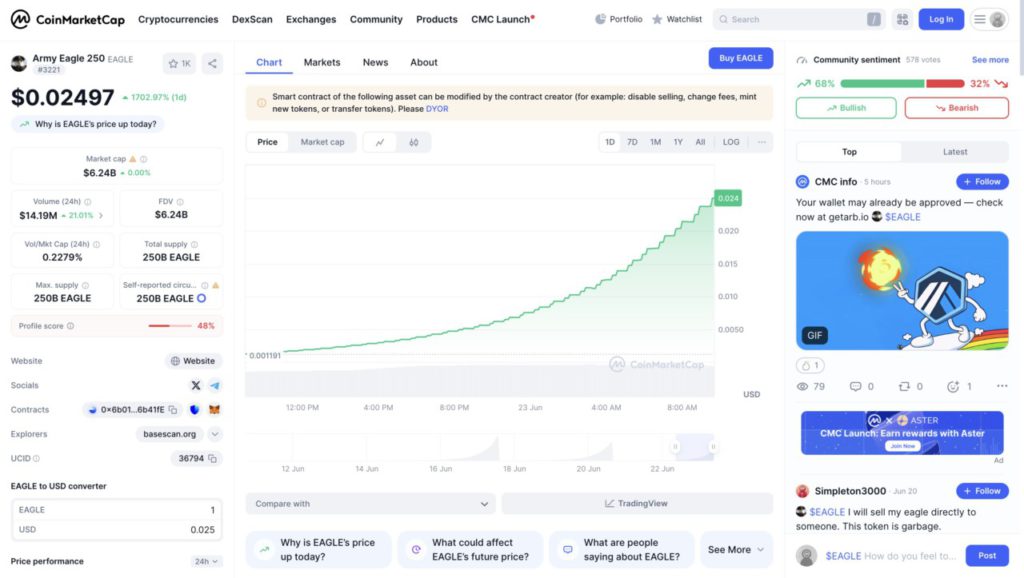 Despite its significant price increase, the token’s profile score is only 48%, signaling potential risk or uncertainty in terms of transparency or investor trust. In addition, there is a warning from CoinMarketCap that the token’s smart contract can be modified by the creator, including the ability to shut down sales, change fees, or mint new tokens – something potential investors should be wary of.