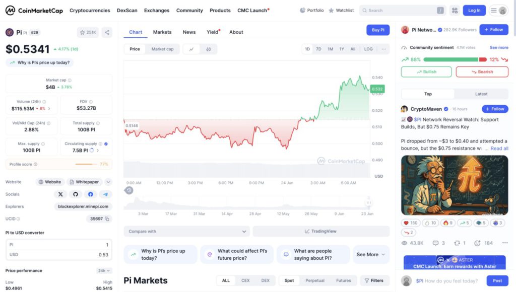 Market conditions were supported by overwhelmingly positive community sentiment, with 88% of investors being bullish. Although daily trading volume decreased by approximately 8% to $115.53 million, market capitalization rose to $4 billion, reflecting the market’s growing confidence in Pi Coin (PI).