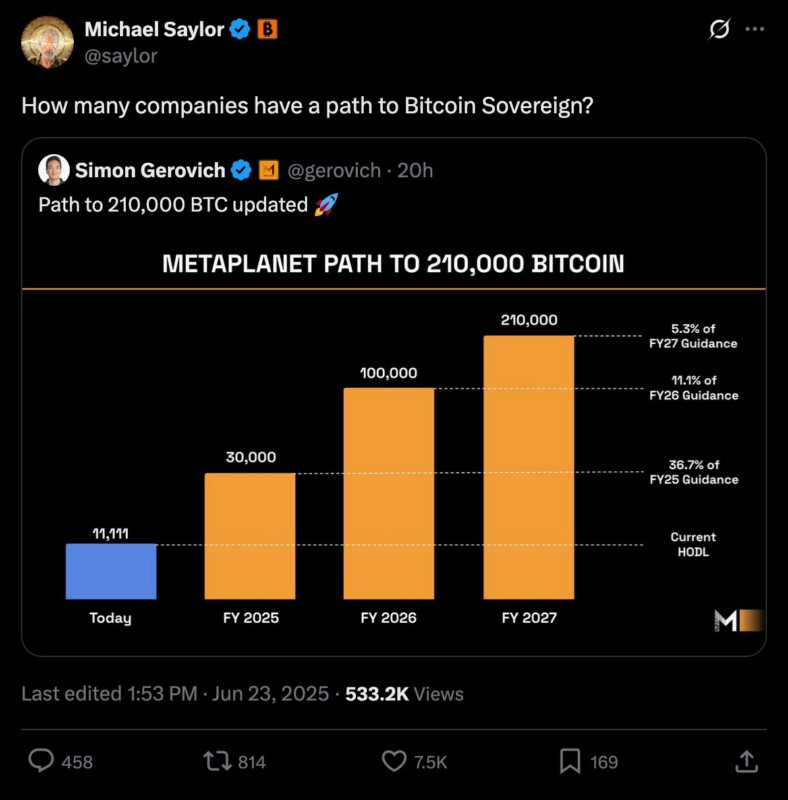 The Tokyo-listed company now has a total of 11,111 BTC, as part of their grand plan to accumulate 30,000 BTC by the end of this year. According to its updated roadmap, Metaplanet aims to have 100,000 BTC by 2026 and 210,000 BTC by 2027.