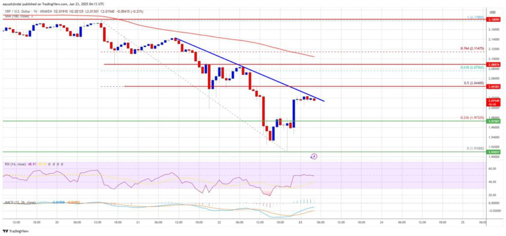 This recovery includes a rise above the 23.6% Fibonacci retracement level of the move down from $2.178 to $1.91. However, the current price is still below $2.02 and the 100-hour simple moving average. The price faces strong resistance near $2.02, which is marked by a bearish trend line on the hourly chart of the XRP/USD pair.