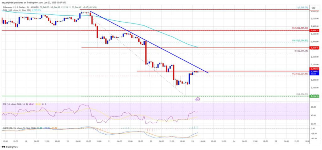 After hitting a low of $2,120, Ethereum (ETH) is trying to recover. There was a slight rise above $2,200, and the price managed to break the 23.6% Fibonacci retracement level of the last drop from $2,568 to $2,114. Despite the recovery attempt, Ethereum (ETH) is still trading below $2,300 and the 100-hour simple moving average.