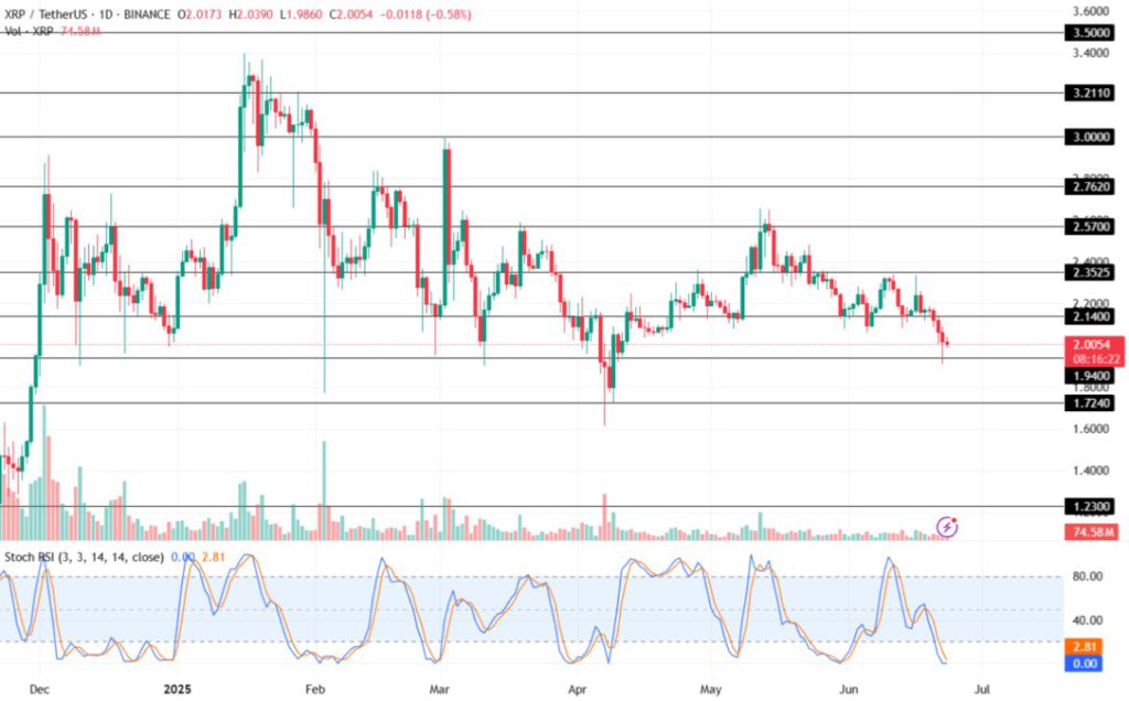 XRP (Ripple) price today dropped below the $2 mark for the first time since April 2025, indicating increased selling pressure. With a weekly correction of around 15%, its market valuation dropped to $116.26 billion with a market dominance of 3.7954%.