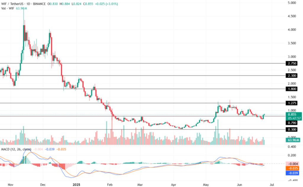 WIF is seen forming a support/resistance pattern in the US$0.79 zone, which according to the analysis suggests further strengthening potential. The MACD indicator also reflects increasing buying pressure and the 12- and 26-day EMAs are converging – an indication that the market is favoring this altcoin.