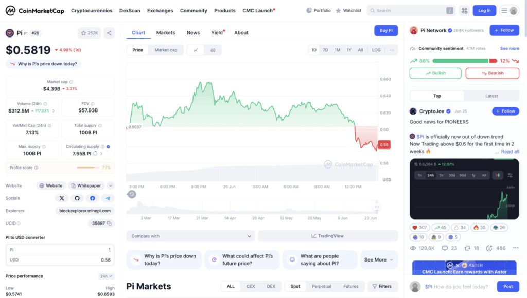 However, after reaching its peak, PI prices began to correct gradually throughout the morning. Market sentiment seemed to change, leading to a sharp decline towards noon. The price dropped drastically to its daily low of US$0.5741, before recovering slightly and settling at US$0.5819 at screen capture time.