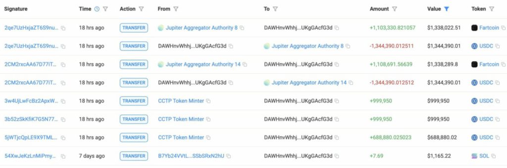 Jakarta, Pintu News – Two “whales” have recently made massive purchases of FARTCOIN, signaling a potential price explosion that may occur. Within 24 hours, they had invested a total of $8.7 million to buy more than 7.2 million FARTCOIN, at an average price of $1.20 to $1.22 per token. Although the price is currently hovering around $1.17, a 2.46% drop in a day, this large-scale buying spree is indicative of increased confidence from savvy investors.