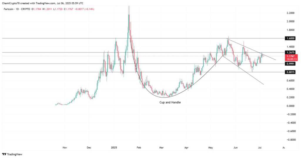 FARTCOIN’s daily chart shows a well-formed cup and handle pattern, a classic bullish reversal signal. The neckline of the pattern is around the $1.2575 resistance level, which has been a key barrier in recent weeks. Currently, the price is consolidating below the downtrend line, forming the “handle” of the structure. If the price manages to break above $1.26, the pattern will be confirmed and will likely trigger a rally towards $1.60.
