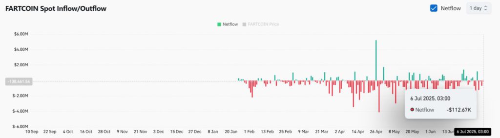 Despite the latest whale activity, Spot Exchange Netflow on July 6 showed a figure of -112.67K according to CoinGlass. This means that more FARTCOIN is exiting exchanges than entering, suggesting that investor behavior broadly still prefers to hold rather than sell. This trend continues to support the supply shortage narrative. Although whales have injected new liquidity, the lack of significant inflows suggests that sellers are not dominating.