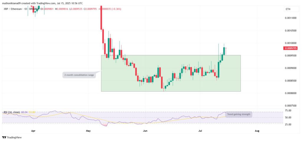 The Ripple (XRP)/Ethereum (ETH) ratio has come out of a two-month consolidation, driven by increased demand from institutions. When this ratio increases, it indicates that Ripple (XRP) is performing better compared to Ethereum (ETH), which could help drive the rally towards $4.