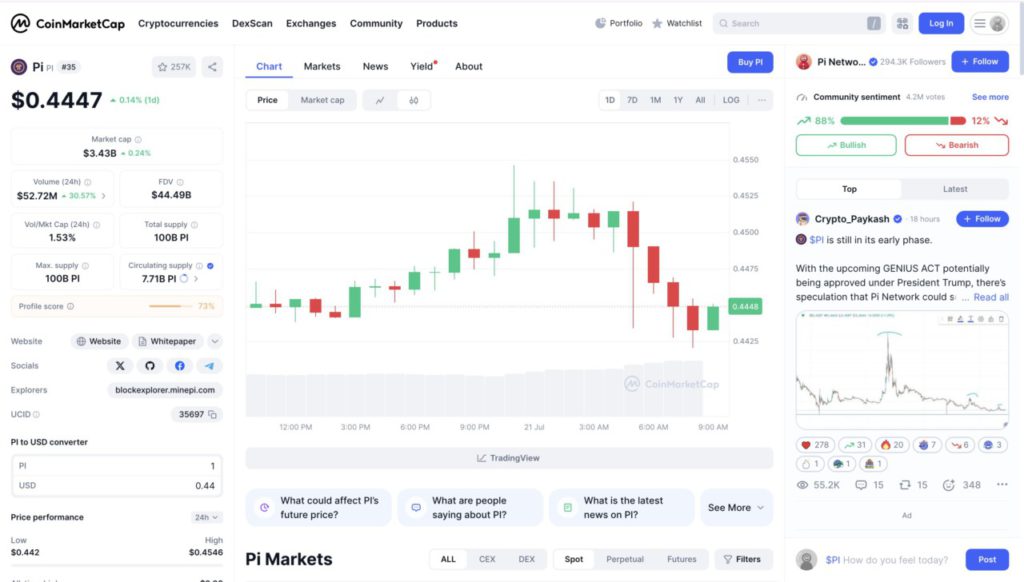 Currently the price is showing recovery attempts with the last green candle signaling a potential reversal in the short term. Community sentiment towards PI is still predominantly positive, with 88% bullish based on 4.2 million CoinMarketCap user votes.